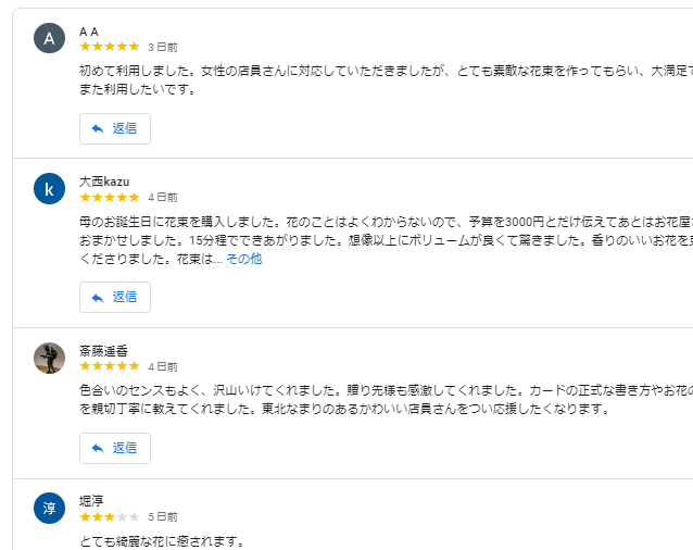 グーグルマイビジネスで花屋を検索した方の中には、実際に利用した感想やレビューを投稿できる機能があります。
